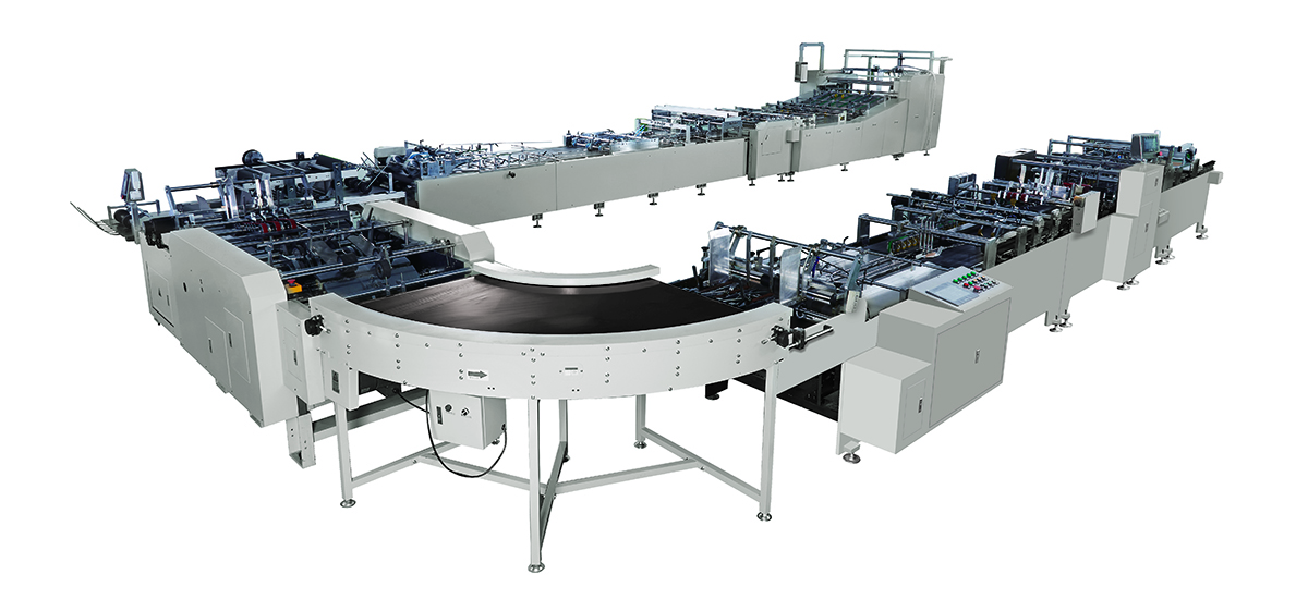 该方案是以单张纸、头卡和底卡为原料,由飞达进行全自动送纸,经由输纸平台进行输送,然后用前规、侧规进行单张准确定位,送入压线部压竖线。自动涂胶(可同时喷热熔胶),成型,自动折风琴,自动压筒,再经由推规定位,送入压横线装置压横线,再进入拉底,上底胶,底部成型,一次完成。本机采用触摸屏控制,制袋精度髙,速度快,全过程自动化,生产效率与传统手工制作相比提供几十倍,是加工出口型手提袋,髙档奢侈品手提袋的理想全自动设备。