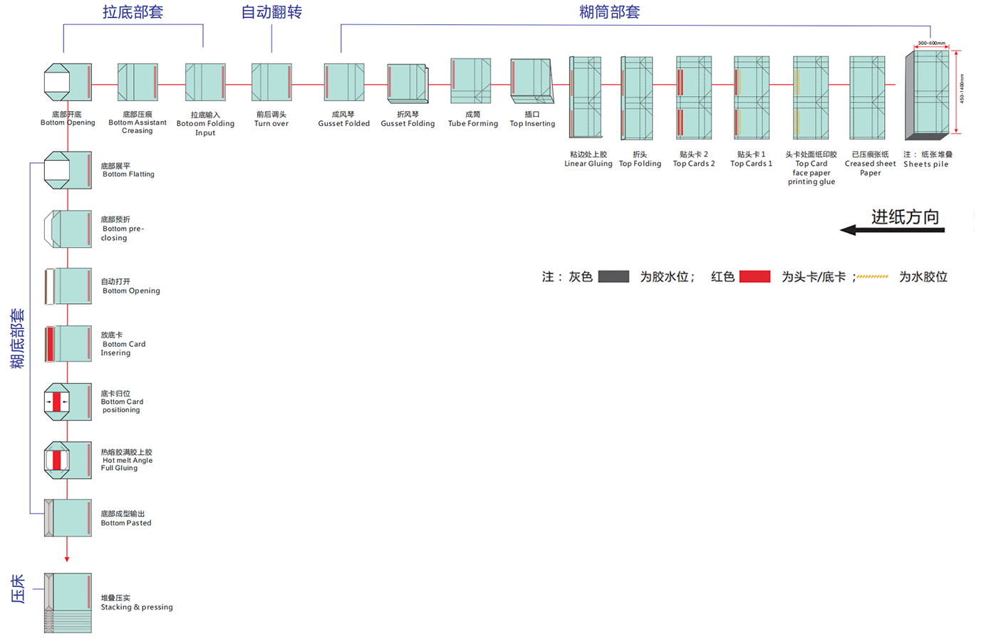 一次性完成折袋口, 糊筒,折底,放底卡, 底部上胶封合等纸袋工序和工艺;